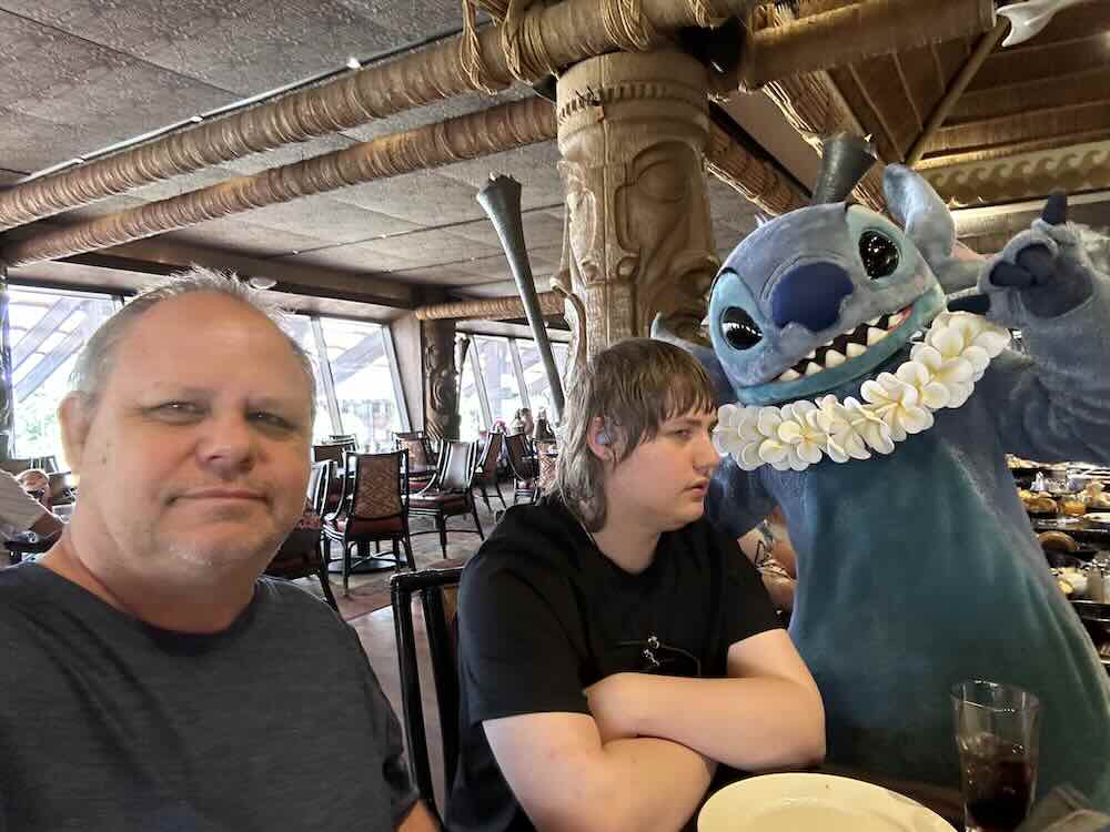 The food was OK, but nothing to write home about. Since we had booked breakfast, the waiter served some diced fruit, punch (jungle juice), and then a skillet of breakfast foods, which he placed in the middle of our table—a sort of mini table buffet. Some Mickey and Stitch-shaped waffles arrived not long thereafter. Joey ate a couple of sausages and some cooked ham, so he at least ate something. Otherwise, he said he didn’t like the food, it was too loud, and he wanted to leave. Nice. There’s nothing like a relaxing family meal together, and this was nothing like a relaxing family meal together.