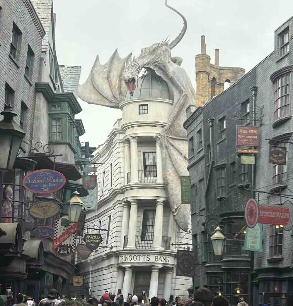 Having gotten the Transformer’s ride thrills out of our system, we eventually moved on to Diagon Alley. The weather was now starting to look a bit more iffy, but it was still dry. The main thrill ride in Diagon Alley is Escape from Gringotts. It’s a more intense, dark rollercoaster ride that requires you to ride with no personal effects on your body. Wallets, phones, glasses, backpacks, etc., must all be stowed away first, lest you lose them on the ride because of all the G-forces. There are special lockers for just this reason, but stowing our things in them turned out to be a frustrating process of epic proportions.