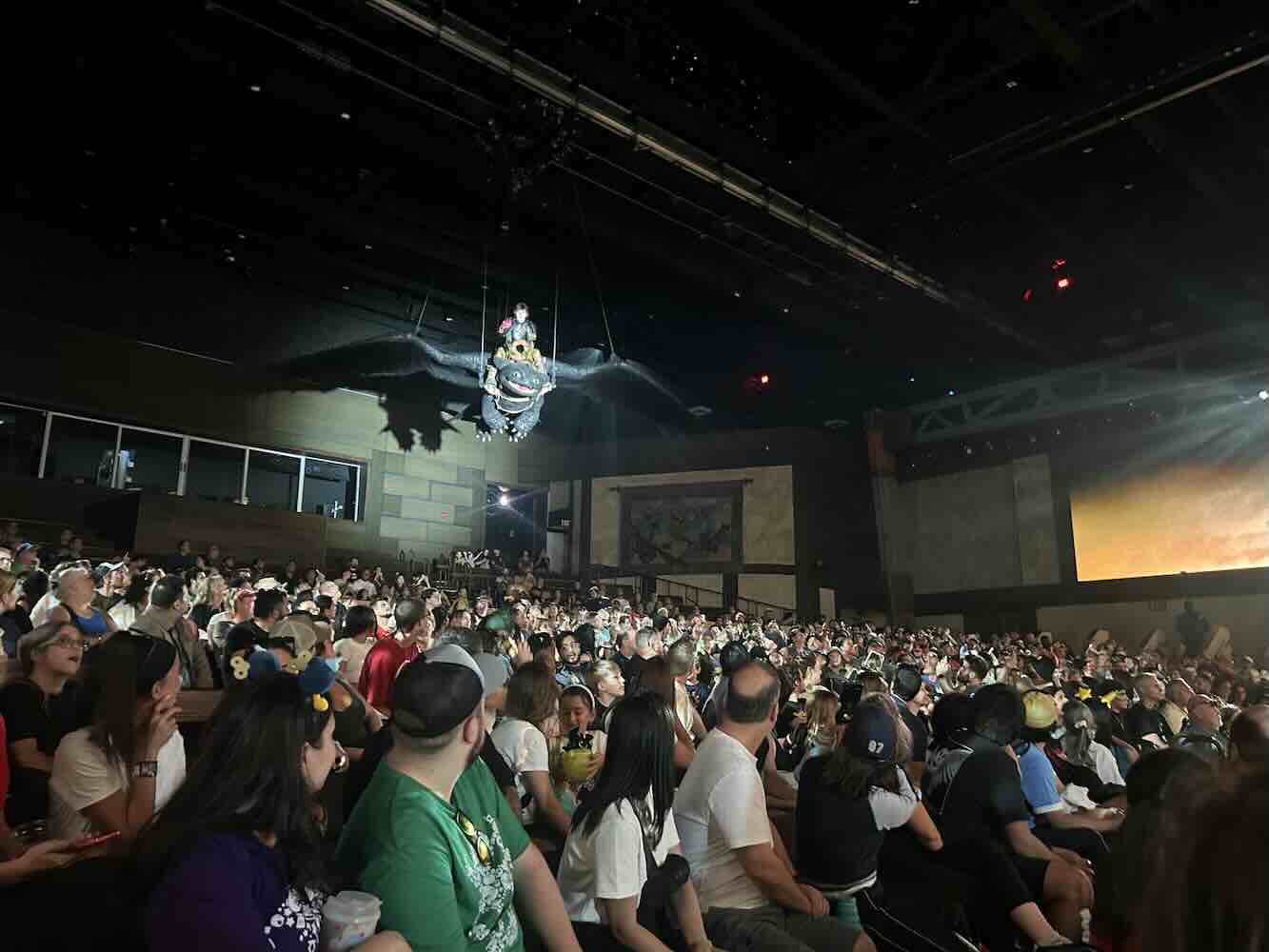 The show itself was terrific. The entire rear of the stage was an enormous high-definition digital display. Dragons emerged from all corners of the auditorium, including a larger-than-life real Toothless bestrode by Hiccup, flying around back and forth over the audience’s heads. Dragons and villagers from Berk danced around the stage in tune to beating drums.