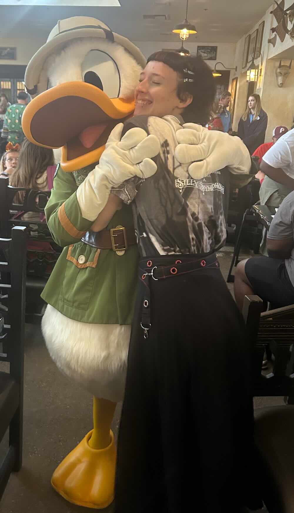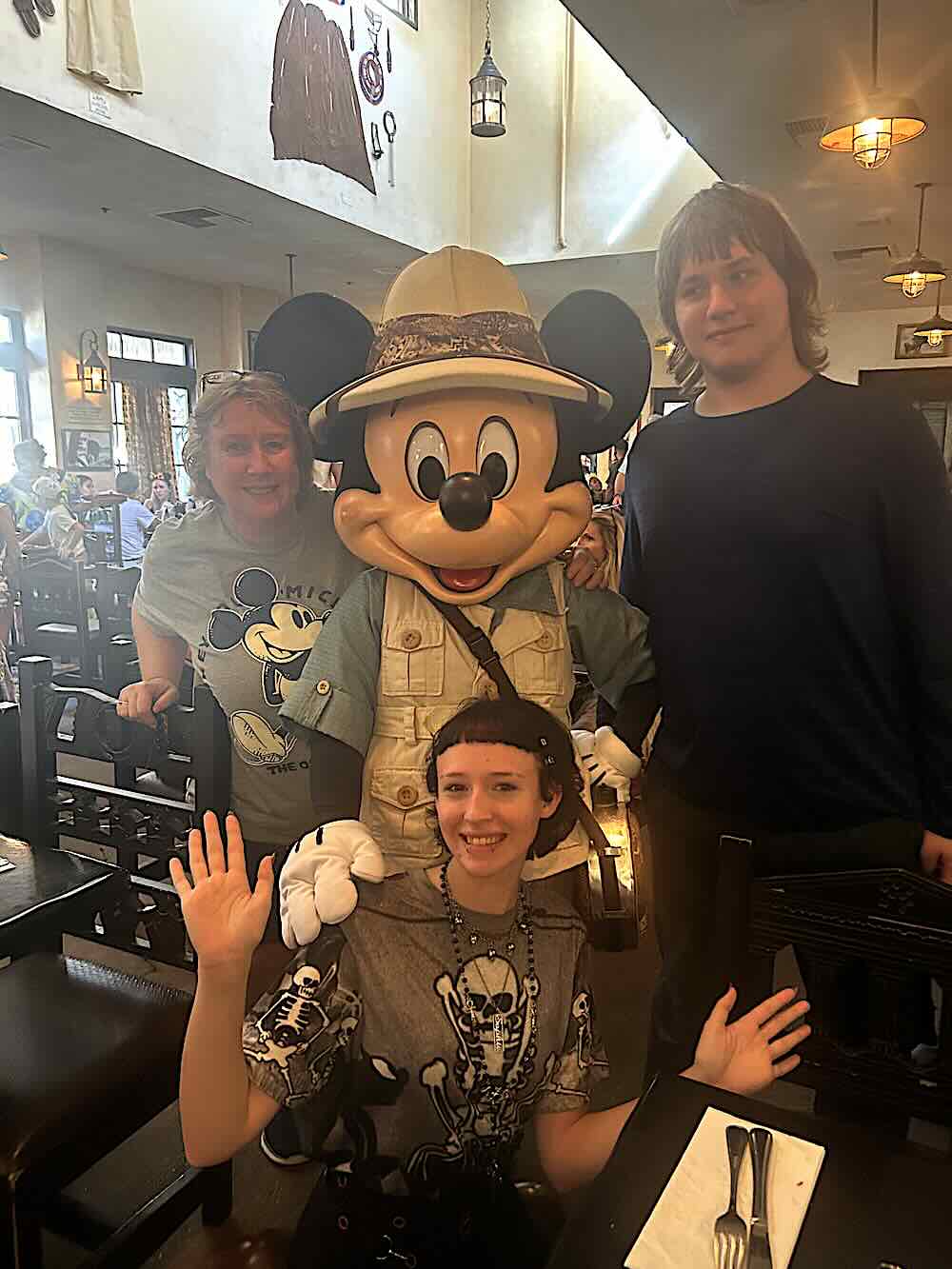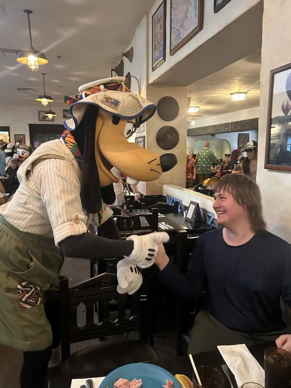 The character dining breakfast here in Animal Kingdom features Donald, Daisy, Mickey and Goofy, all dressed in their safari garb. While we were happily tucking into the reasonably priced (*cough*—I used the word ‘reasonably’ here quite wrongly) buffet breakfast, the characters wandered around the dining area, stopping at each table for a couple of minutes to interact with its occupants. Sandy, in particular, has been keen to have as many character interactions as she can, whether that be through Disney character dining, like this morning, or with chance interactions with characters we meet throughout the parks. To be fair, it does also seem to put a smile on everyone’s faces. Joey was his usual morning pleasant self (*cough*—I use the word ‘pleasant’ here also quite wrongly) until Goofy arrived at the table. Goofy’s presence immediately lifted Joey’s mood. It was pretty impressive to see Goofy’s tactics being put to brilliant use here. The cast members are clearly very good at their craft. As with all the other characters, there are no words—just sign and body language. Within seconds, Goofy had Joey not only smiling but actually laughing as the two of them locked fingers and played thumb wrestling together. I’ve observed this transformation in the children in the past when similar expert techniques were put to practical use by the character cast members. It’s not just ‘put on a suit and go’. There’s clearly a lot of training and expertise that goes into their work. Kudos to the cast members for doing such a terrific job.